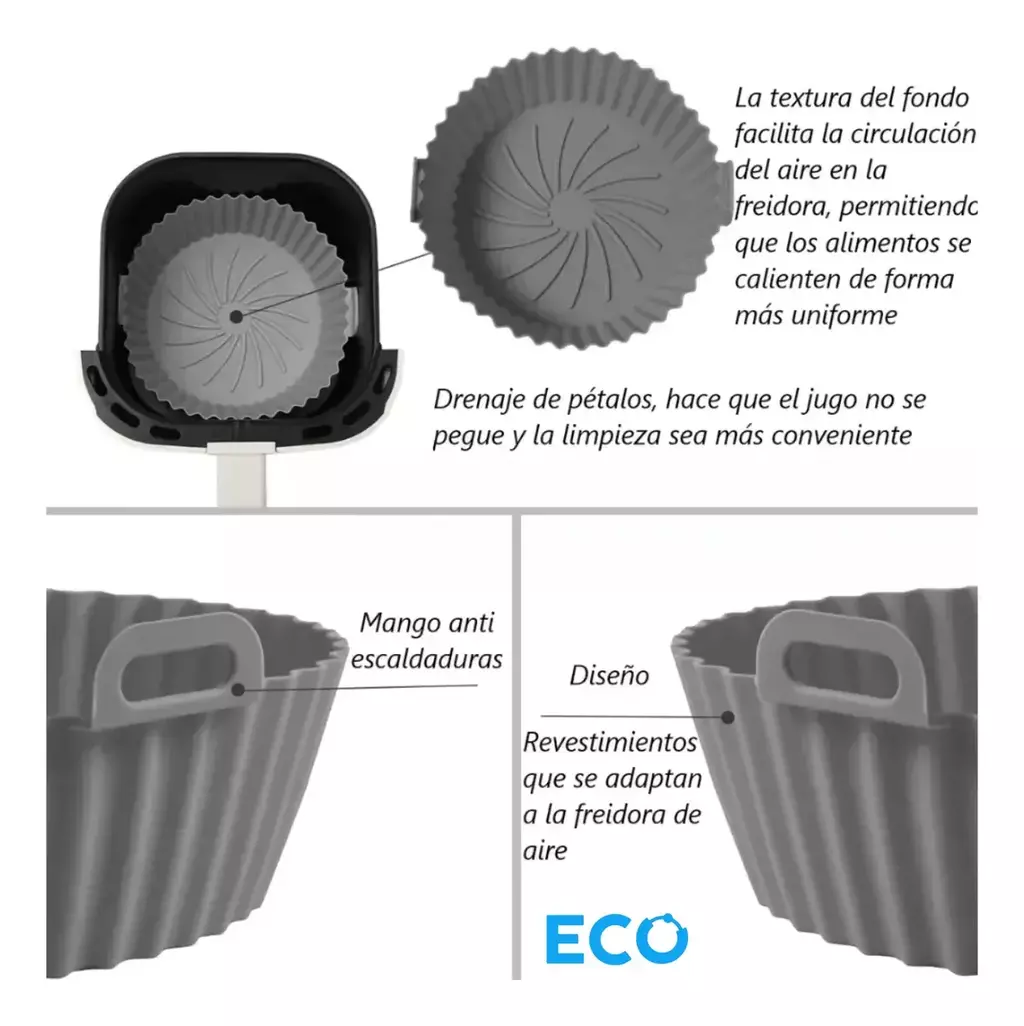Estos moldes reutilizables para airfryer están fabricados en silicona de grado alimenticio, resistente al calor y completamente apta para horno. Gracias a su diseño flexible y duradero, podés usarlos una y otra vez sin que se deformen ni retengan olores.